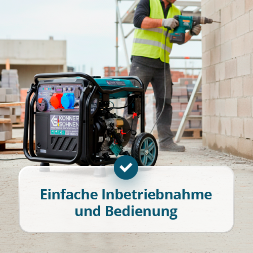 | Ausrüstung | Generator, Verpackung, Bedienungsanleitung, Zündkerzenschlüssel, Gasschlauch mit Druckminderer, Schraubendreher PH2 6,0 mm, Trichter, Zusätzlicher Druckminderer (für Gasflaschenanschluss), Anschlusschlauch für Gasflasche (1,5 m), 2×Transporträder, Transportgriff, 2×Stützfüße |