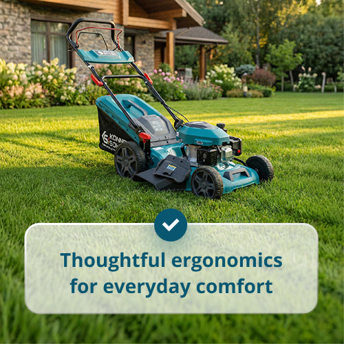 • Minimum Effort Even on Large and Complex Areas. The self-propelled drive function of the lawn mower ensures smooth forward movement without the need to push it manually, significantly reducing strain on the arms and back and making mowing easier during long-term work on large areas and slopes.