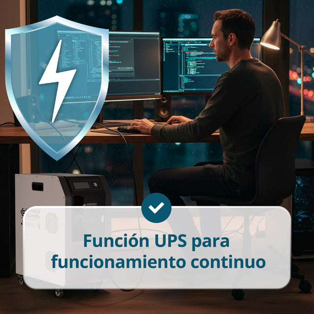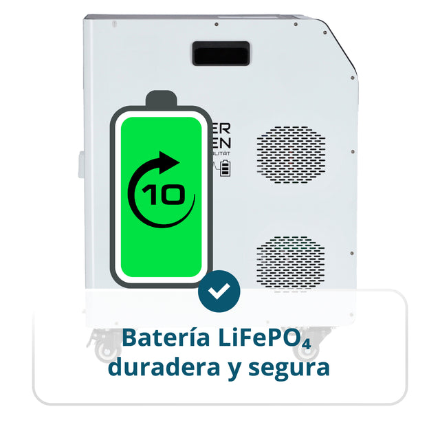 Salida 24V DC para generador o batería, Inverter con onda sinusoidal pura, LiFePO₄ 3,2 kWh, Controlador MPPT, UPS <10 ms, Compatibilidad con Tandem Power, Carga rápida hasta el 80% en 1 hora, Protección contra sobrecarga y sobrecalentamiento, Pantalla LCD con monitoreo de parámetros, Ruedas y asas para transporte |