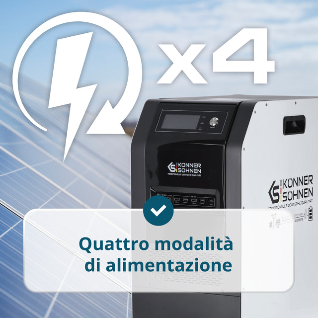 • Compatibilità Tandem Power – controllo intelligente quando si opera insieme al generatore KS 48V-DC: quando la carica della batteria scende, il generatore si avvia automaticamente, funziona alla massima efficienza e si spegne una volta che la stazione è carica.