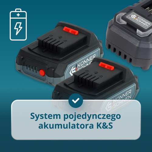 • Praca bez przerw – dwa akumulatory 20 V 2 Ah pozwalają ładować jeden, podczas gdy drugi jest w użyciu.