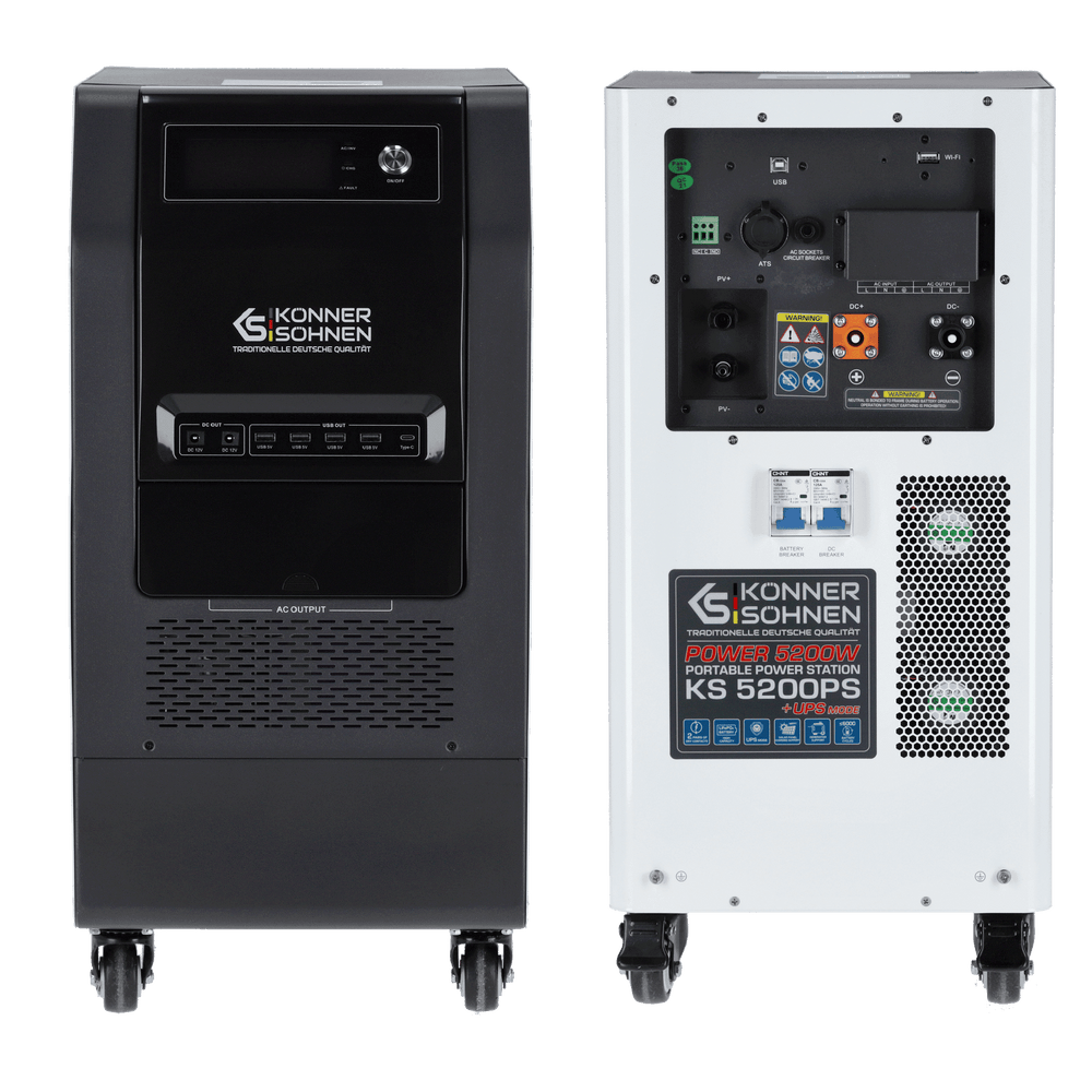 Saída de 48V DC para gerador ou bateria, Inversor de onda senoidal pura, LiFePO₄ 5.12 kWh, Controlador MPPT, UPS < 10 ms, Suporte Tandem Power, Carregamento rápido até 80 % em 1 hora, Proteção contra sobrecarga e sobreaquecimento, Ecrã LCD com monitorização de parâmetros, Rodas e alças para transporte |