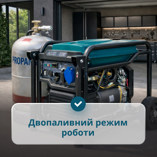 • Можливість роботи на бензині та на газу забезпечує максимальну гнучкість у використанні генератора, ви можете обирати доступне або вигідніше паливо, зменшувати витрати на експлуатацію та залишатися з електропостачанням навіть за обмеженої наявності одного з видів пального.